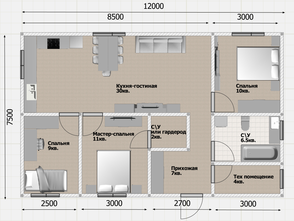 90 м² с тремя спальнями и двумя санузлами — формат полноценного семейного дома.