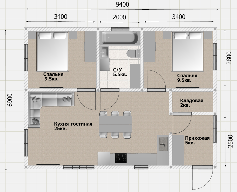 Компактный, но функциональный дом, где каждая зона используется эффективно. Кухня-гостиная объединяет семью, а спальни обеспечивают приватность.